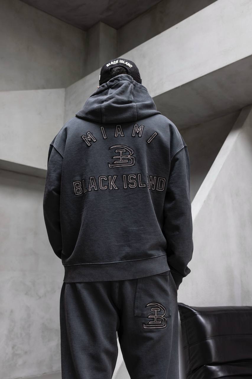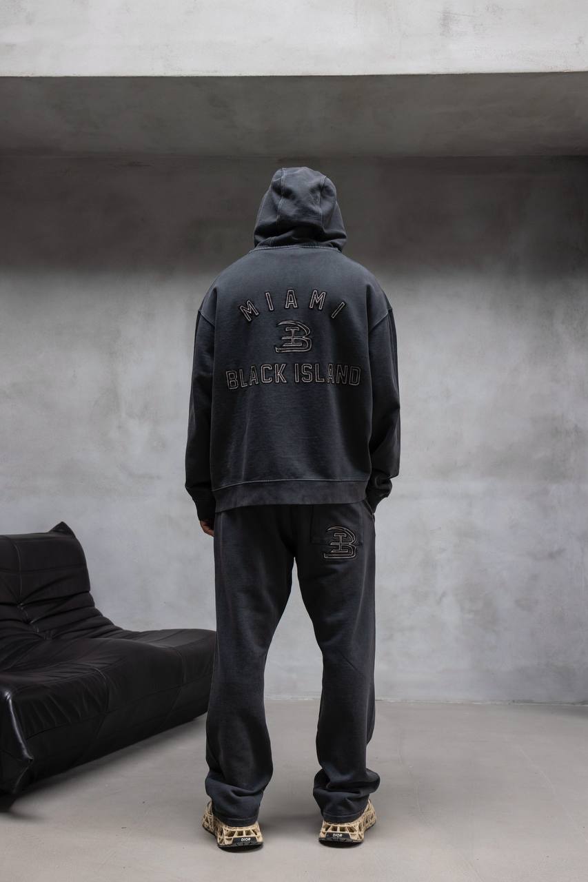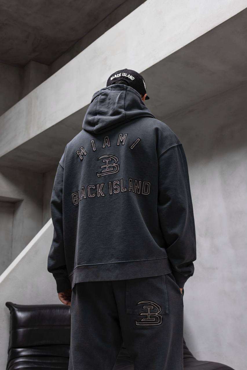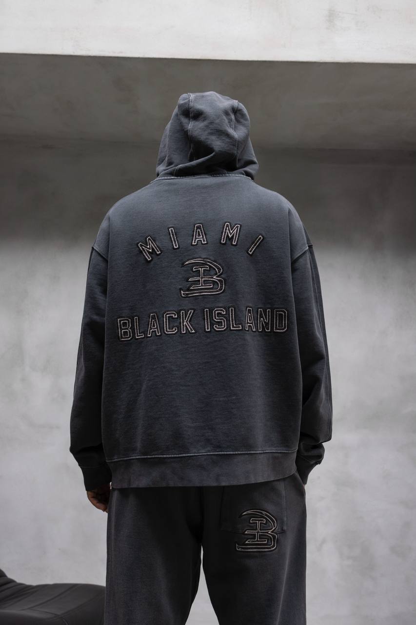 Efectul washed charcoal îi dă un look matur, raw, iar broderiile 3D MIAMI și BLACK ISLAND adaugă un statement vizual solid.