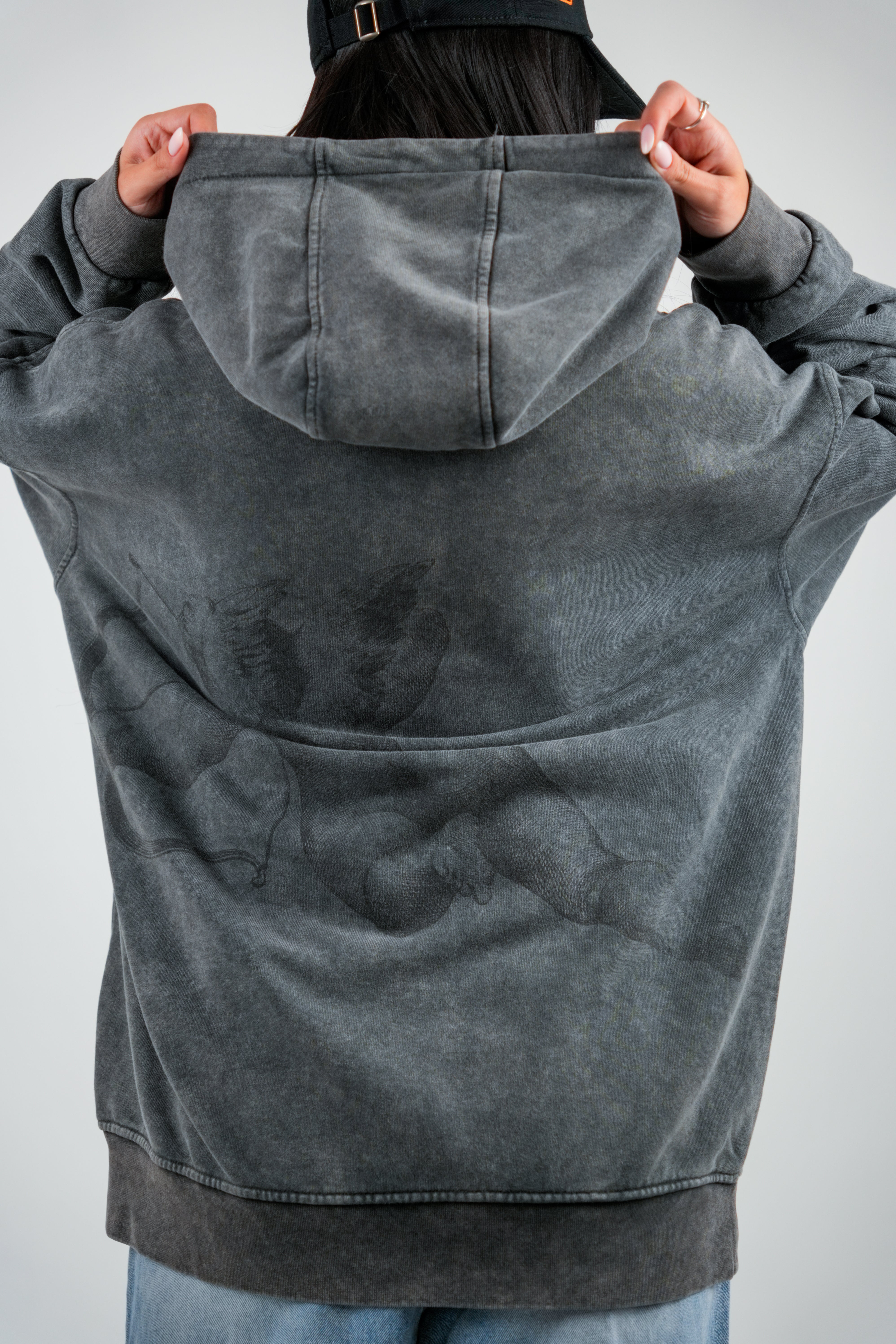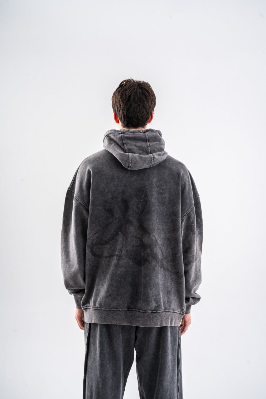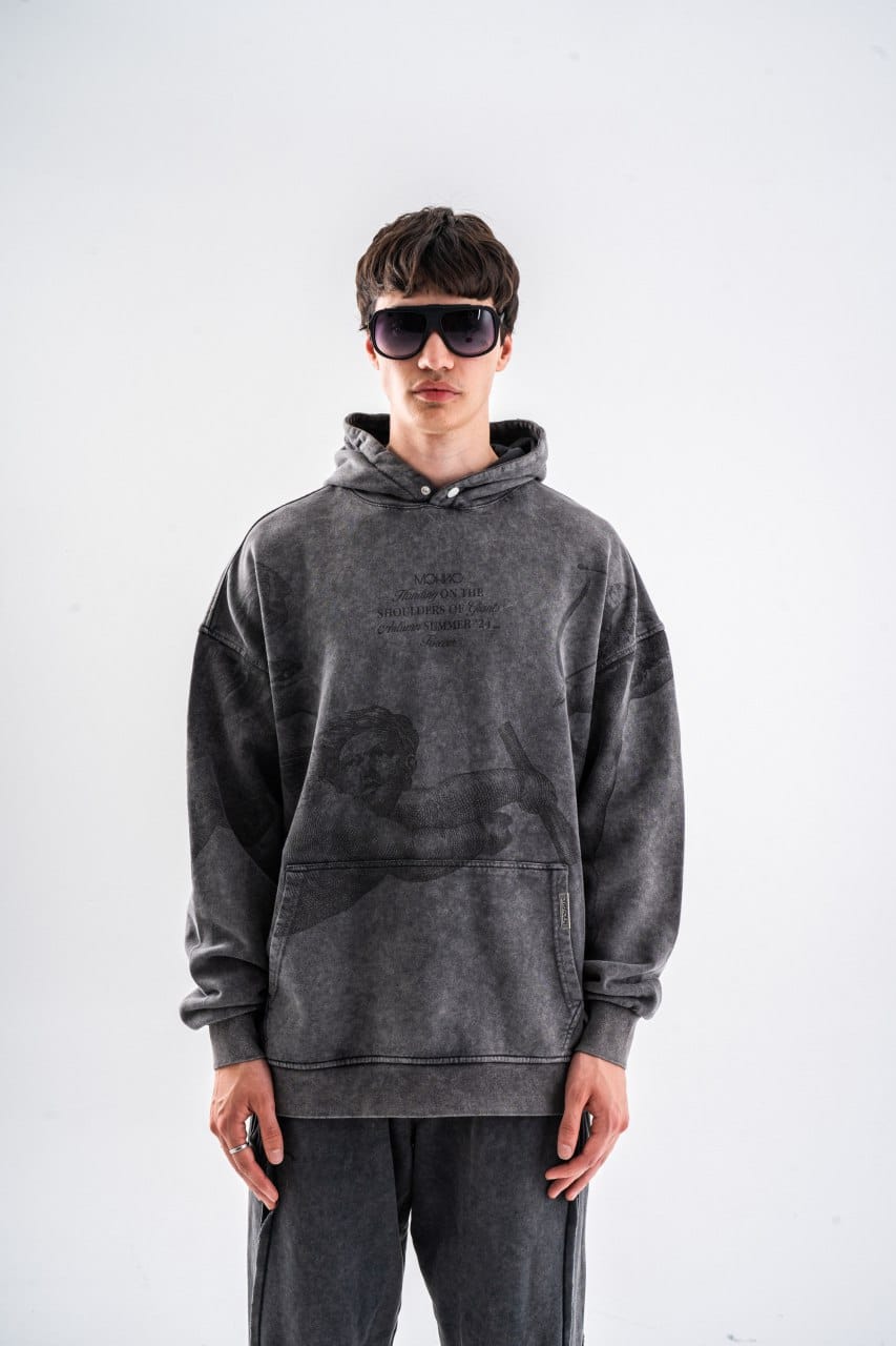 Hanorac oversize imprimat, din bumbac organic, umerii cazuti si baza dreapta. Marimea modelului: 177cm/78 kg și poarta...