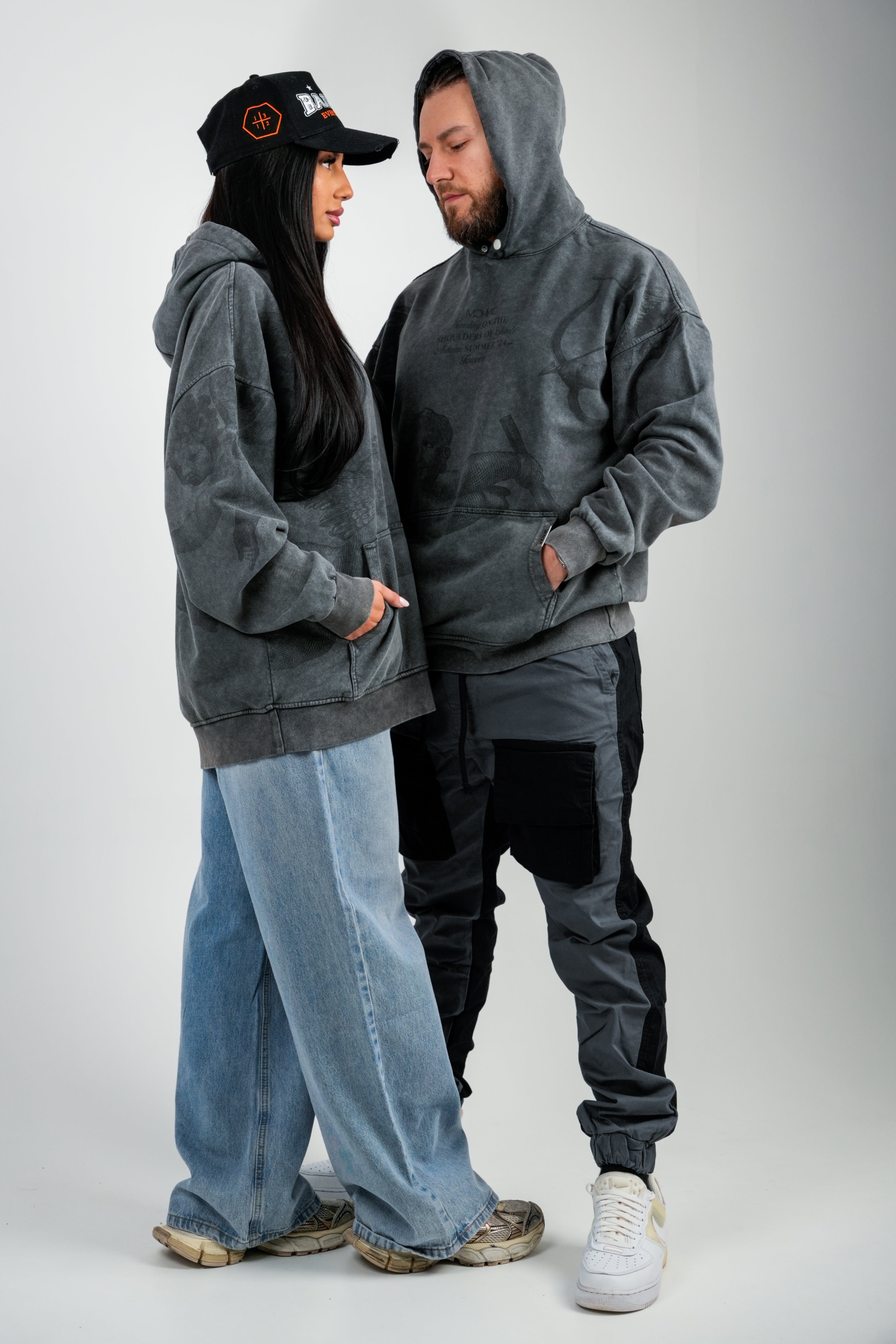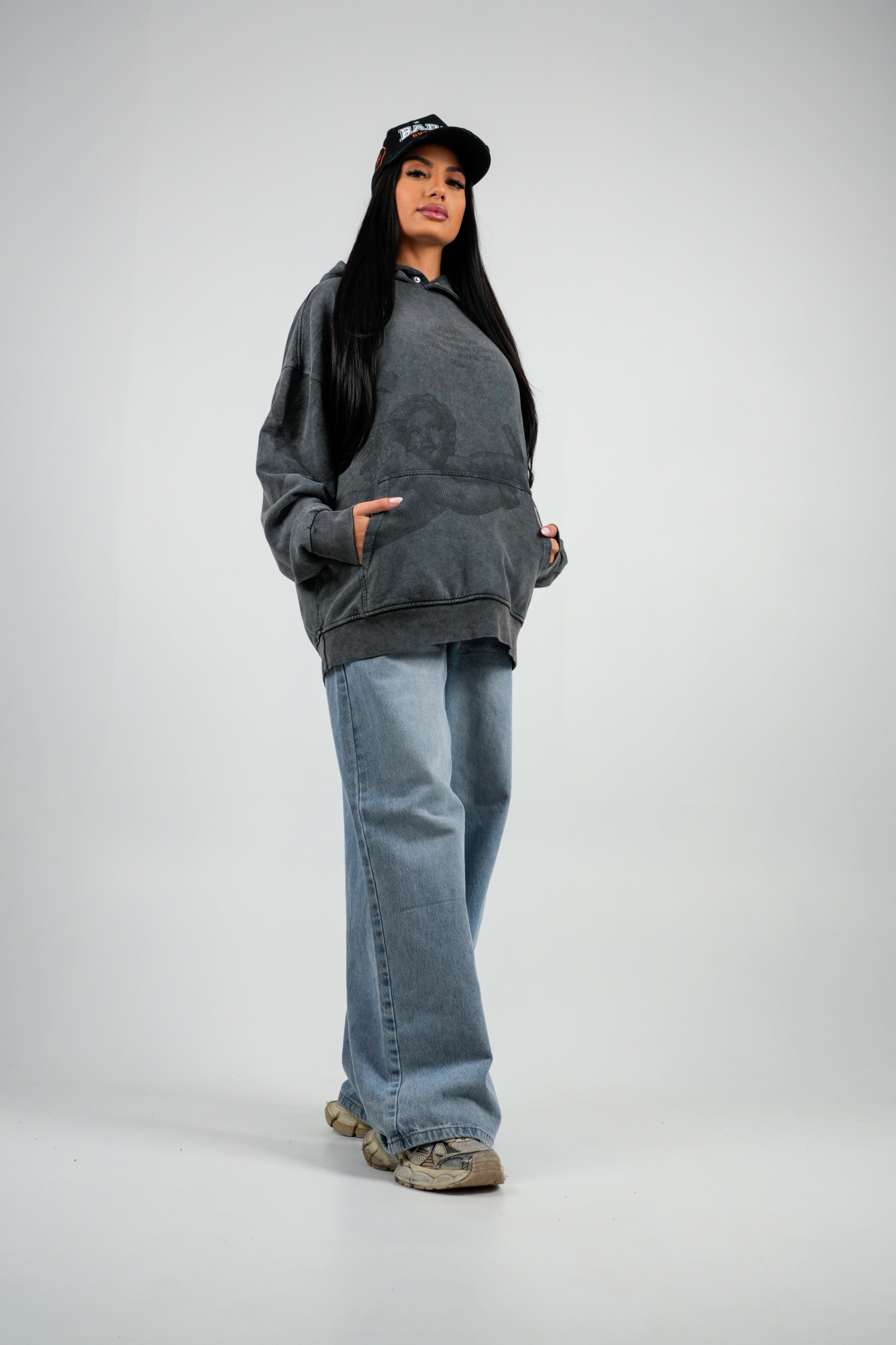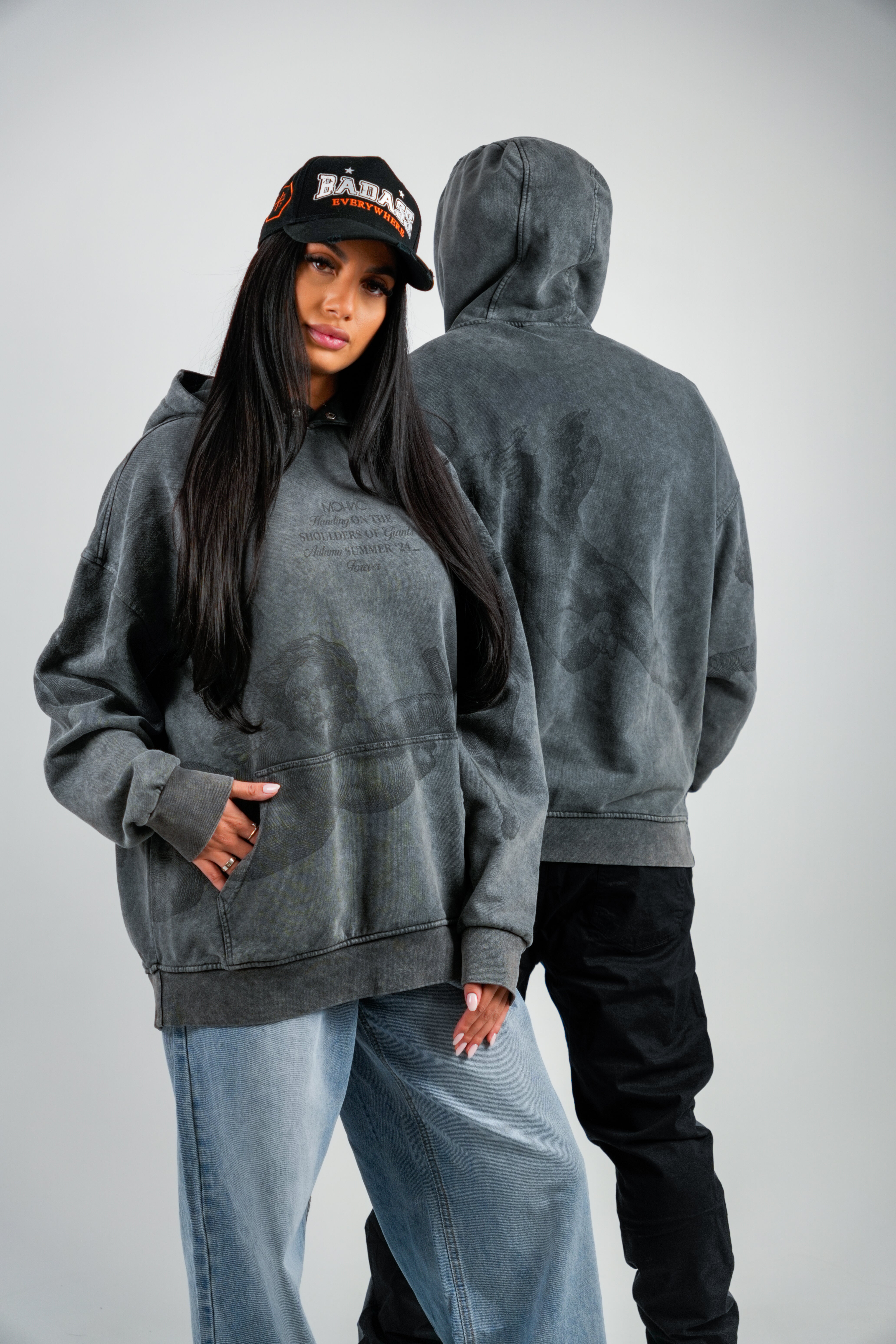 Hanorac oversize imprimat, din bumbac organic, umerii cazuti si baza dreapta. Marimea modelului: 177cm/78 kg și poarta...