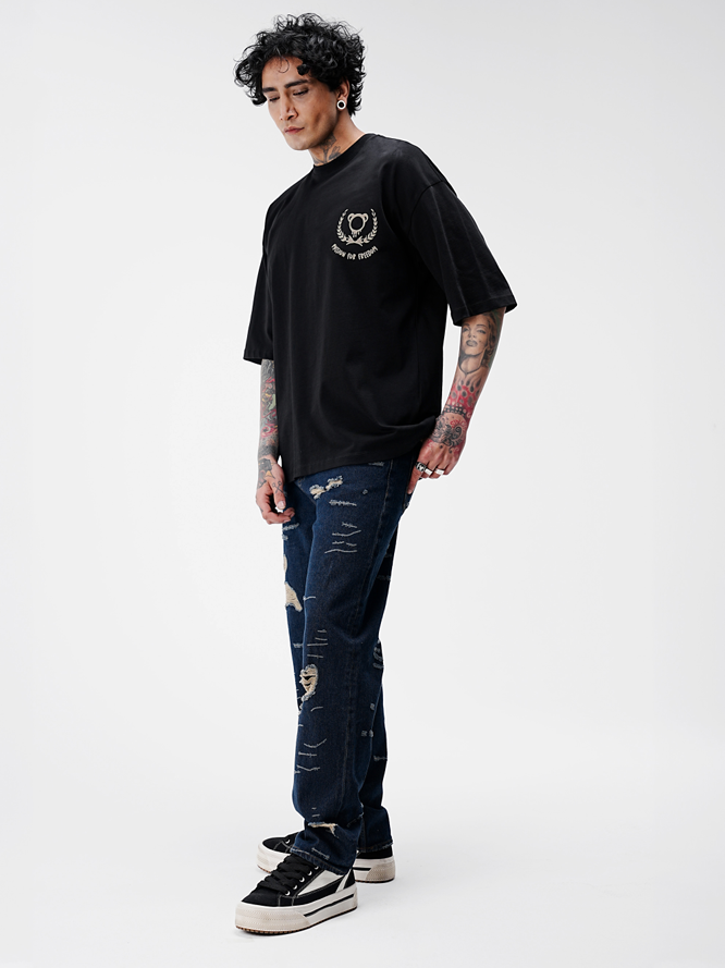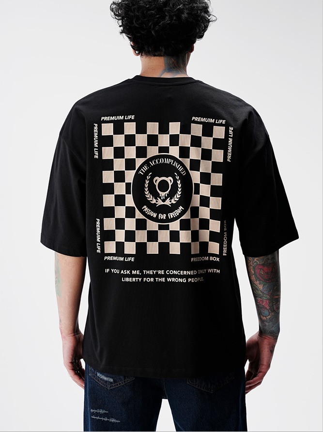 Tricou oversize imprimat din bumbac organic cu decolteu rotund, umeri cazuti si baza dreapta.