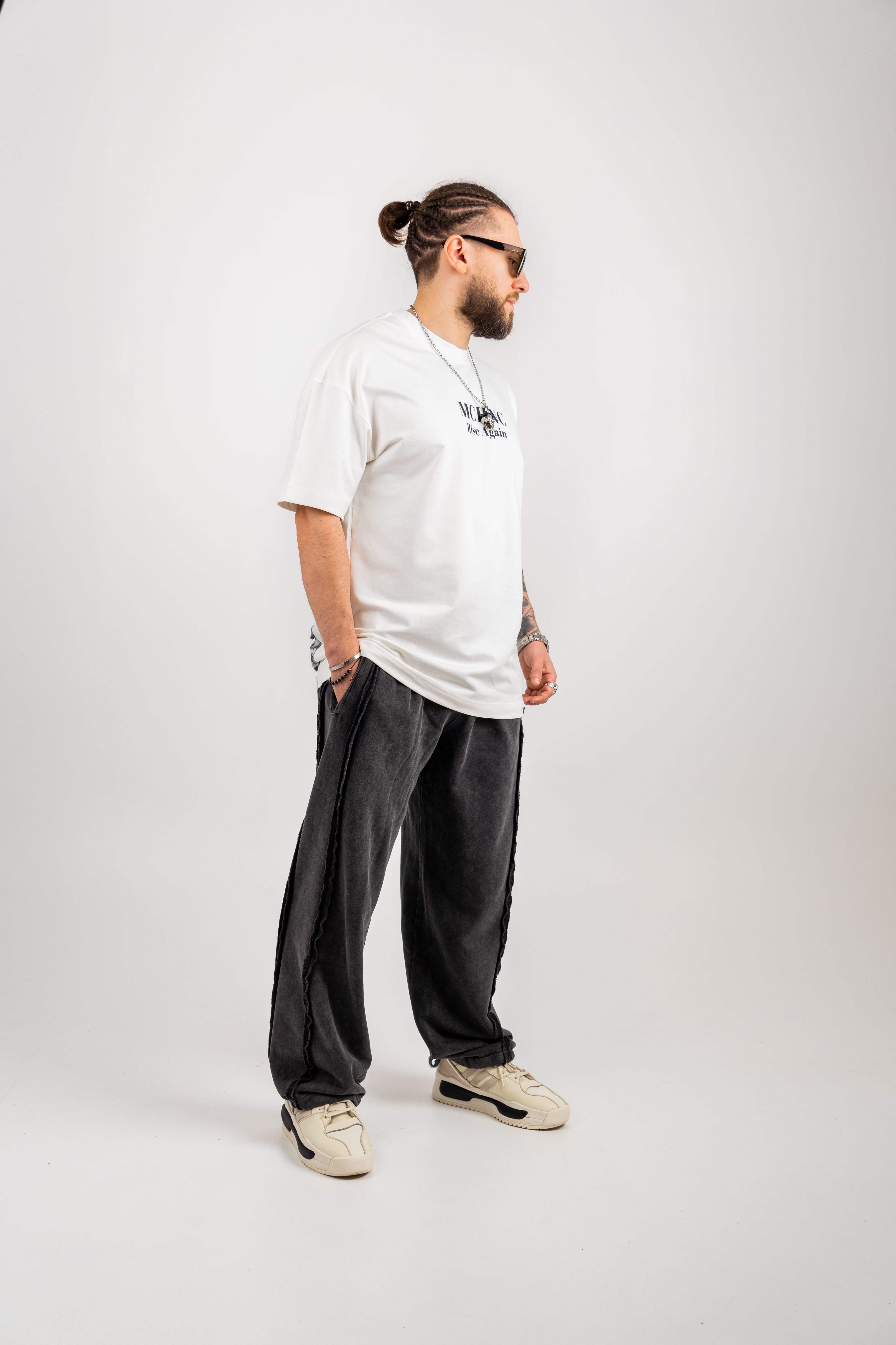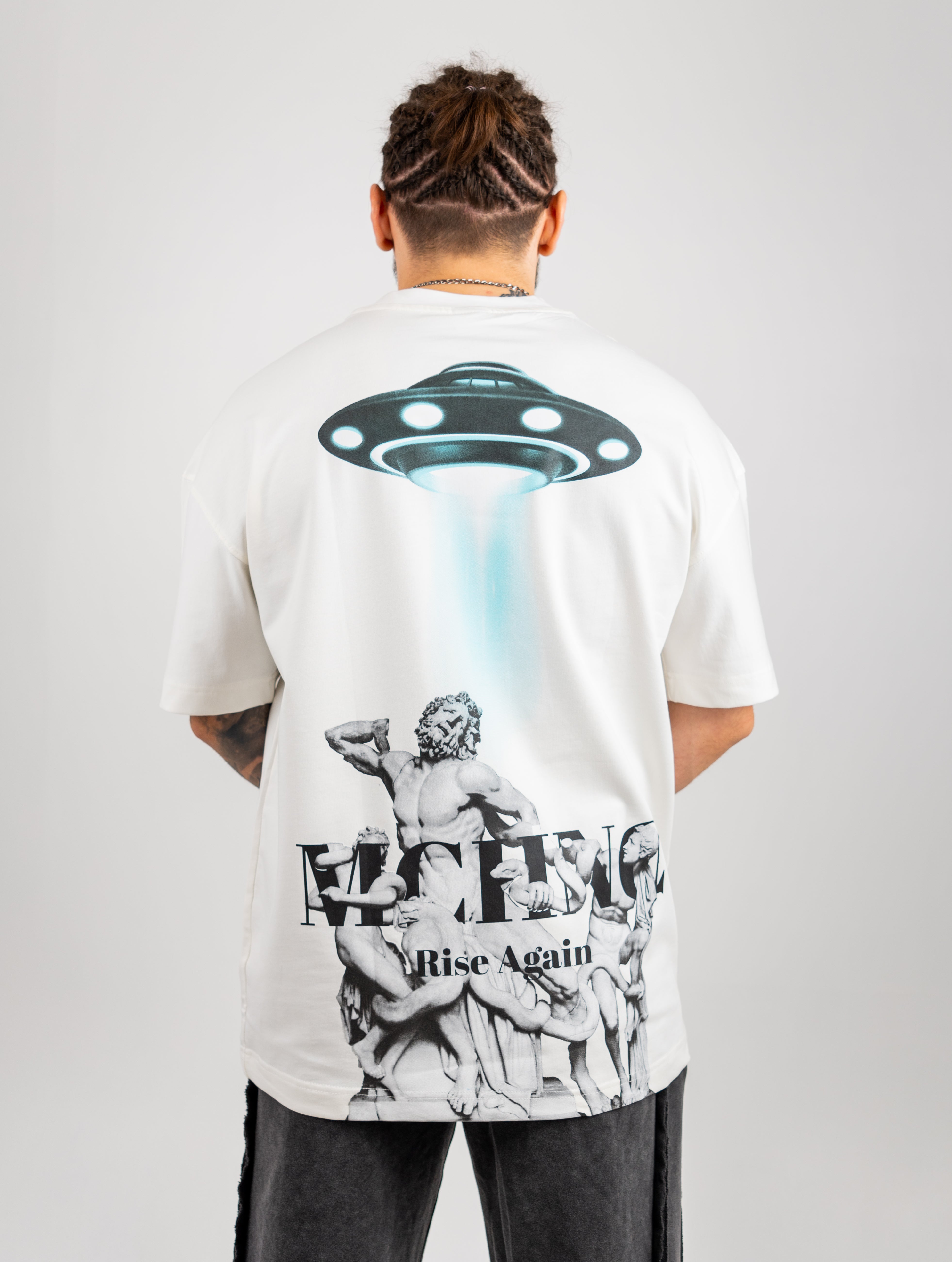 Tricou oversize imprimat, din bumbac organic cu decolteu rotund, umeri cazuti si baza dreapta cu tăietură laterală pe tiv, jos