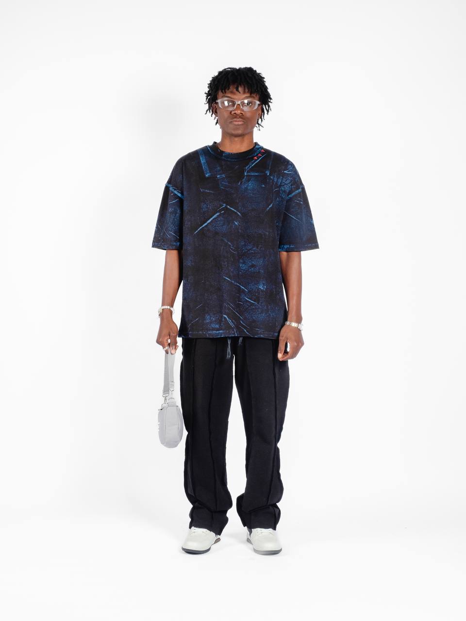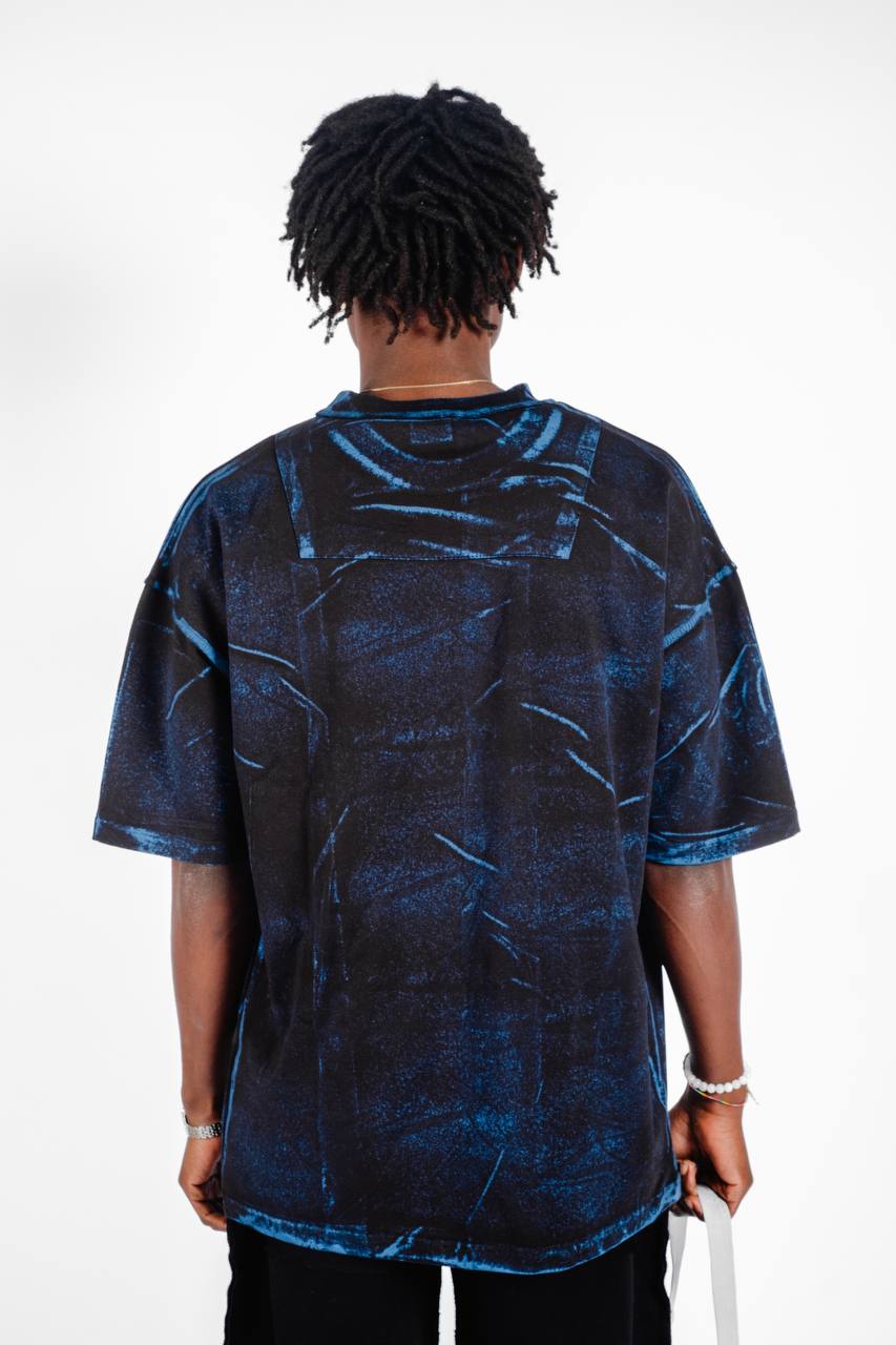 Tricou Oversized Badass Blue MarbleTricou oversized din material premium (95% bumbac, 5% elastan), cu print abstract tip marble în nuanțe de albastru-electric pe fond negru. Croială relaxată, guler întărit și detaliu brodat roșu la baza gâtului – un accent subtil, dar puternic, care scoate tricoul din anonimat. Design urban și artistic, perfect pentru un look streetwear autentic.