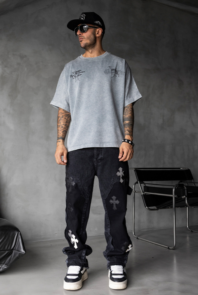 Print grafic complex, frontal și pe spate, inspirat din estetica gladiatorilor și a luptelor de arenă.