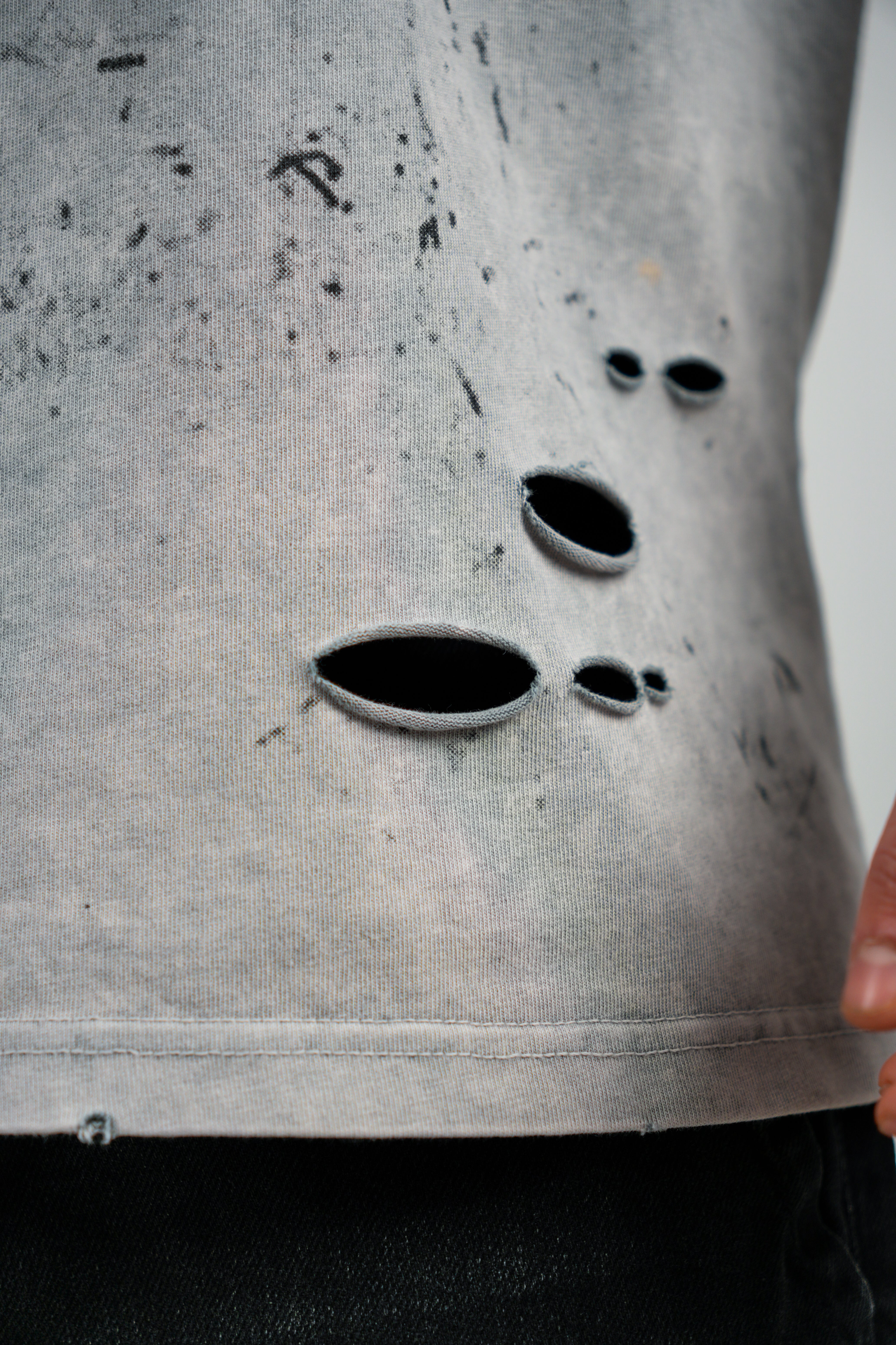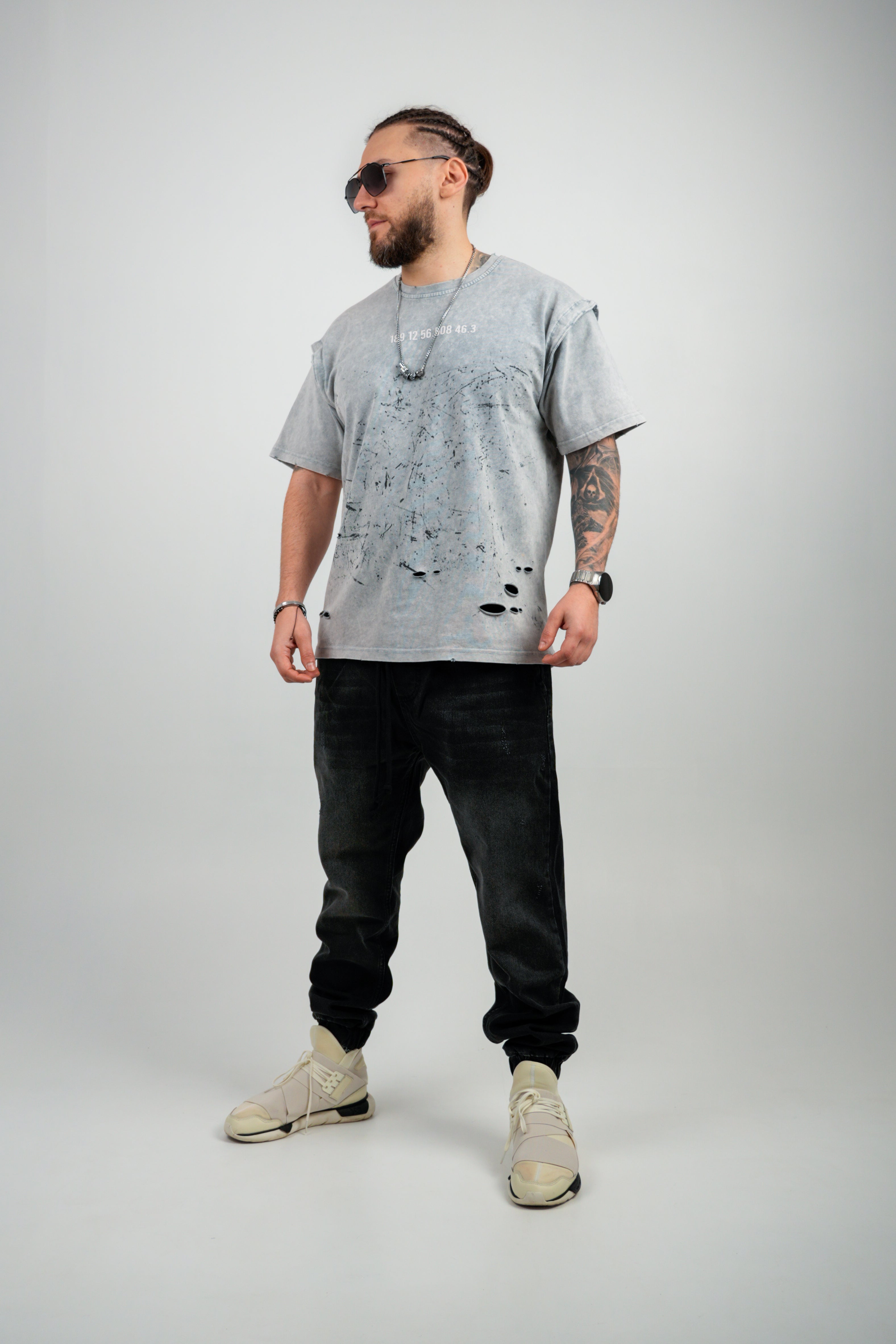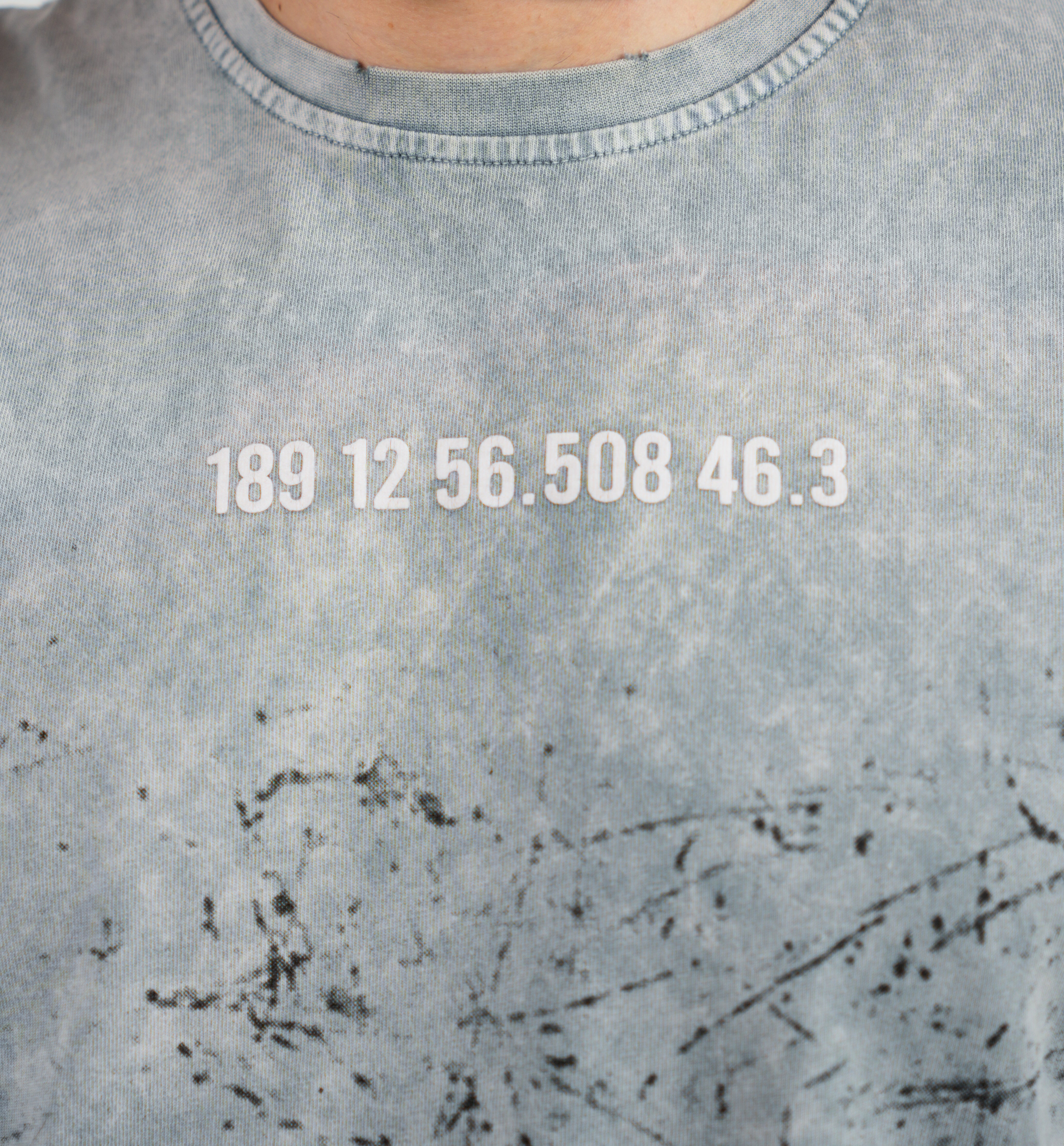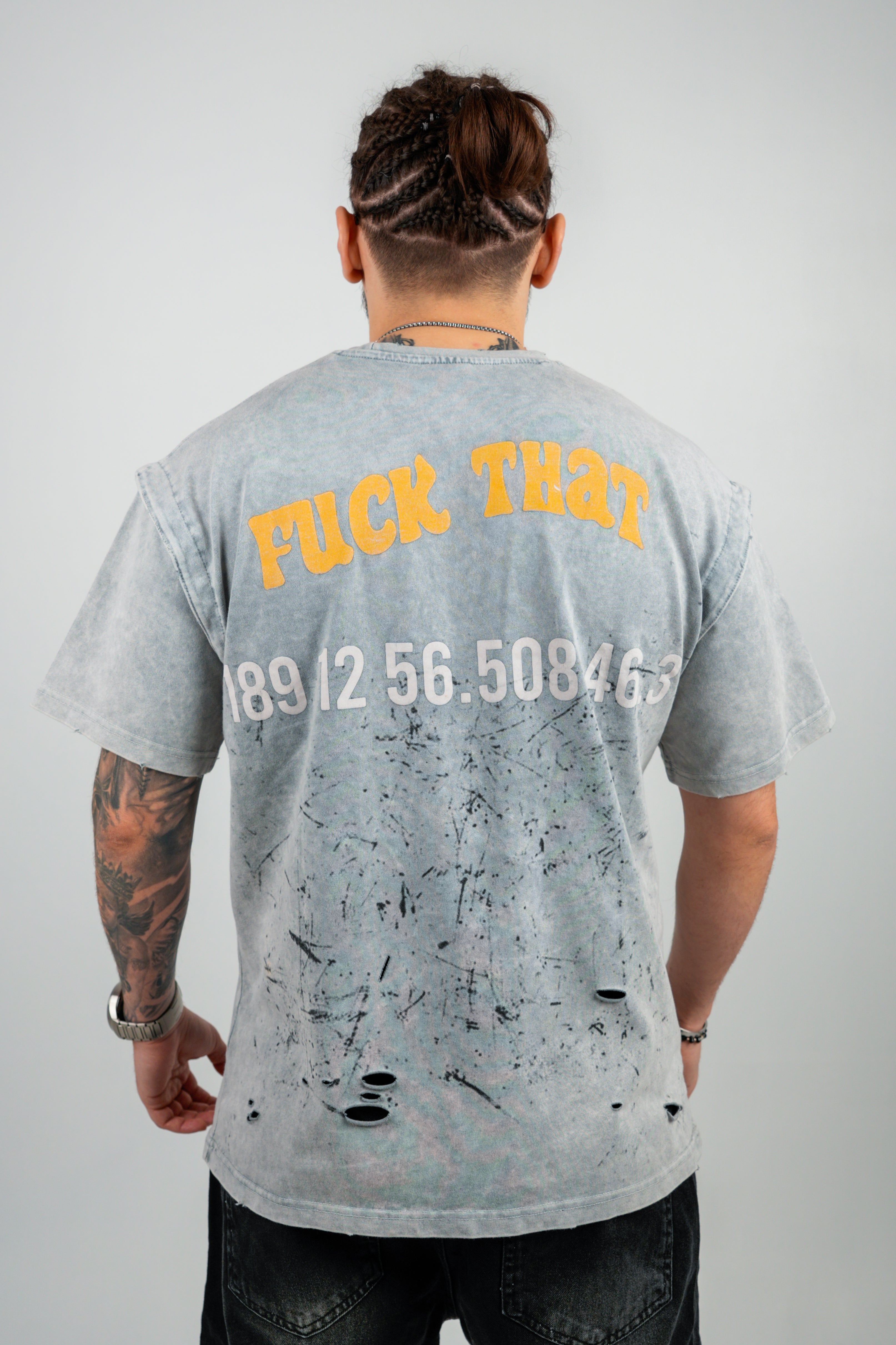 Pe față și spate sunt imprimate coordonate GPS criptice, ca un cod rebel pentru cei care știu. Spatele e completat de mesajul bold „F*CK THAT” în galben vibrant, în contrast cu textura uzată a materialului. Tăieturile și petele intenționate adaugă o estetică raw, urbană, fiecare piesă fiind ușor diferită – o veritabilă ediție limitată.