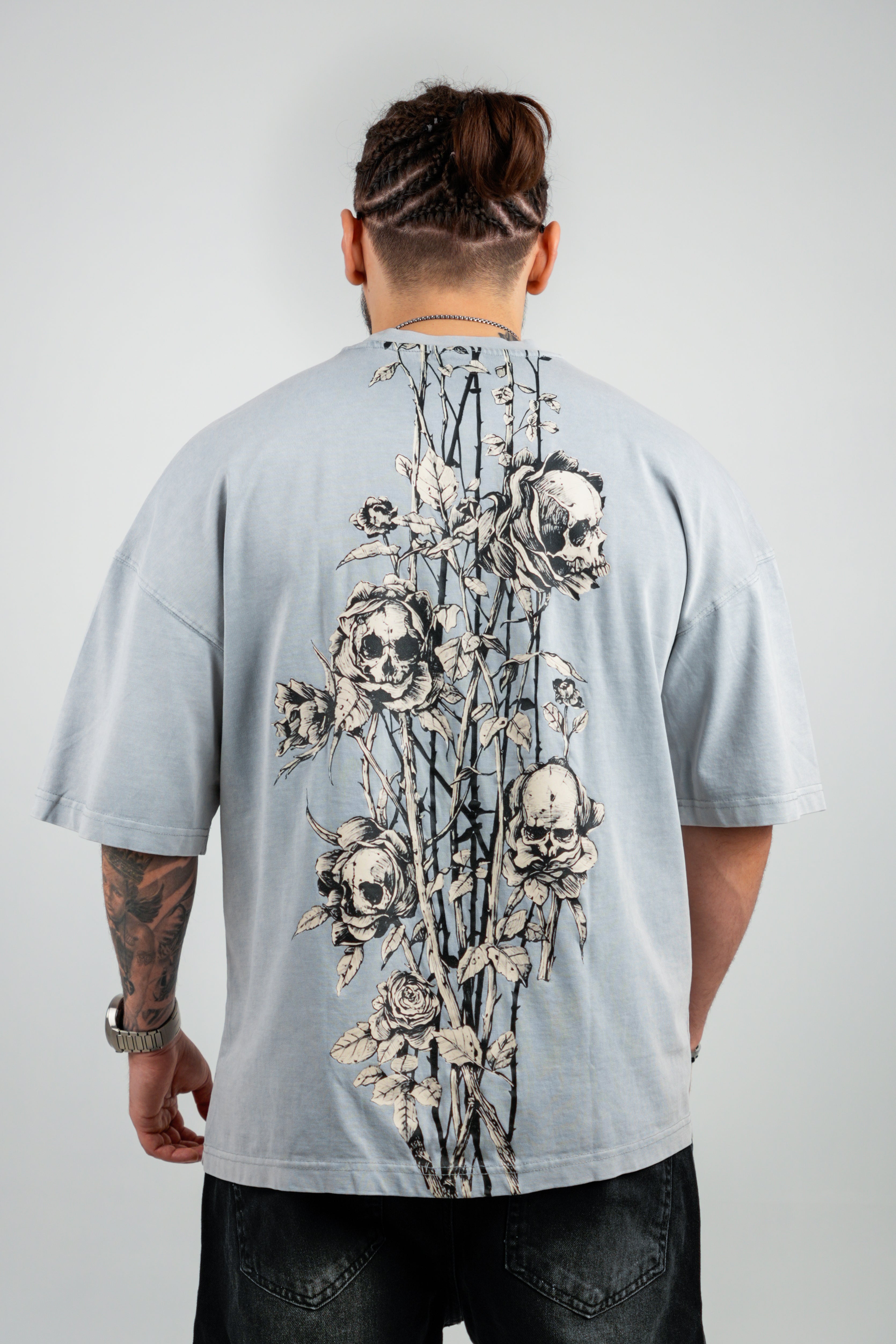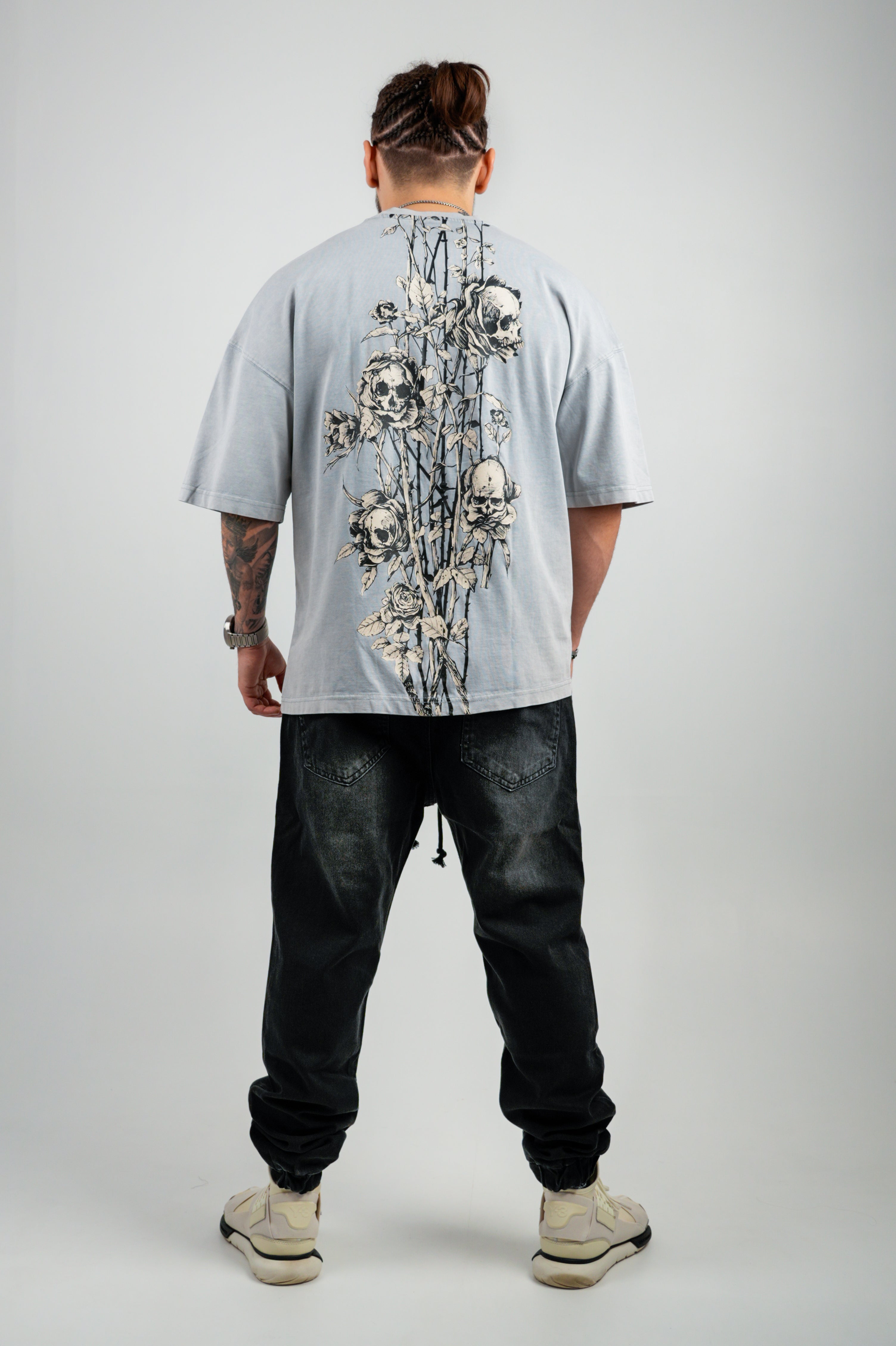 Tricou oversize imprimat, din bumbac organic cu decolteu rotund, umeri cazuti si baza dreapta cu tăietură laterală pe tiv, jos