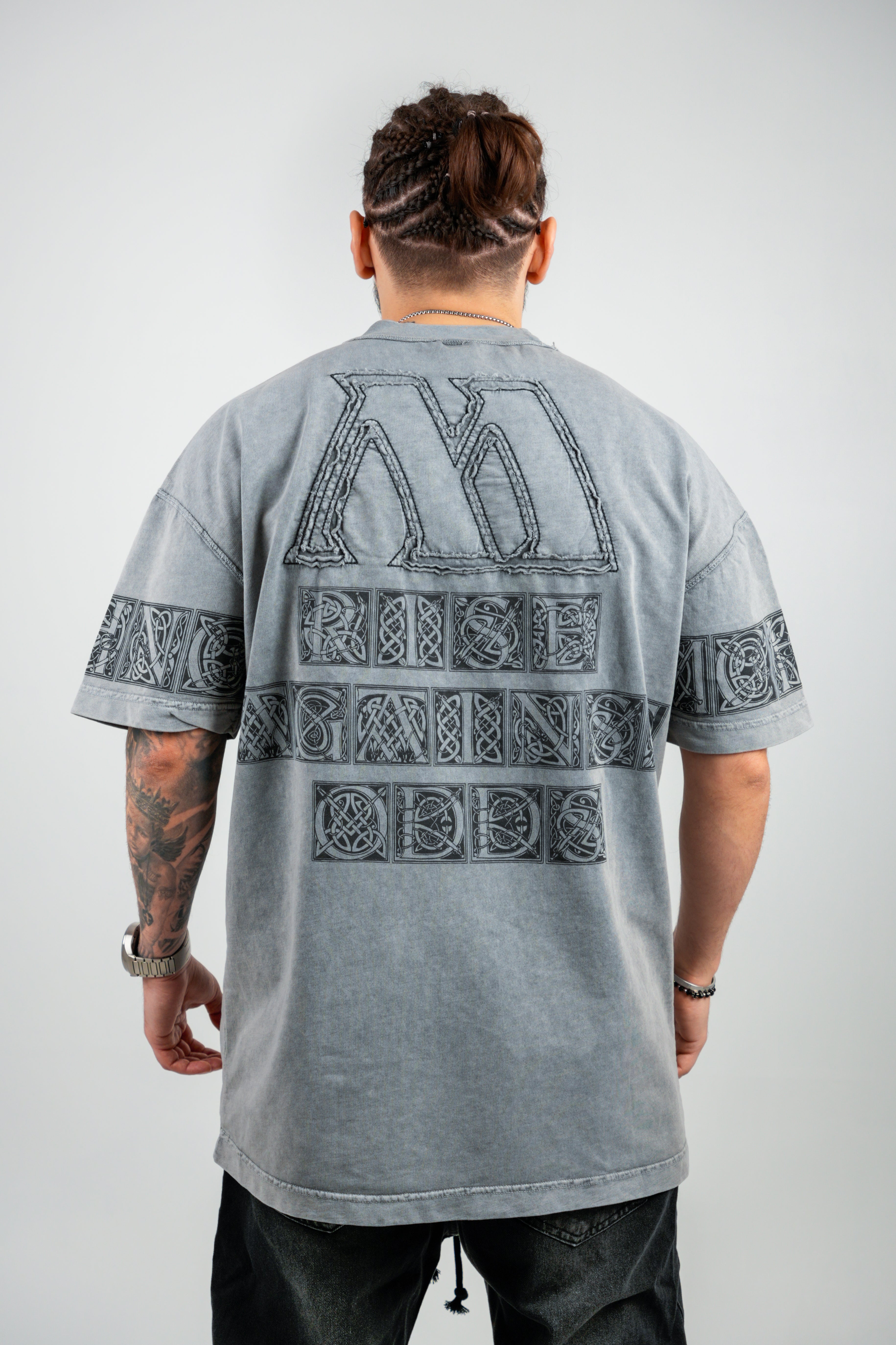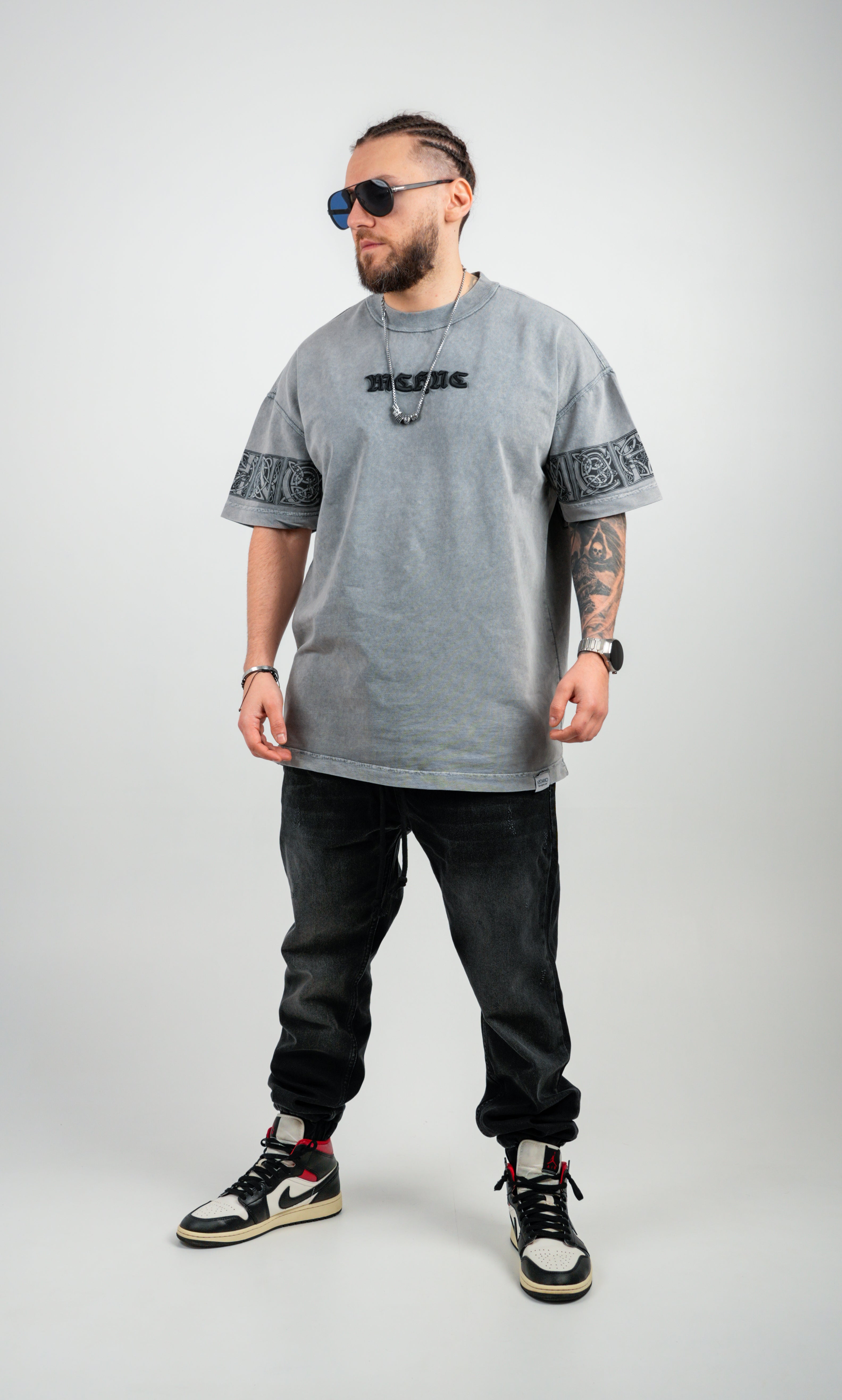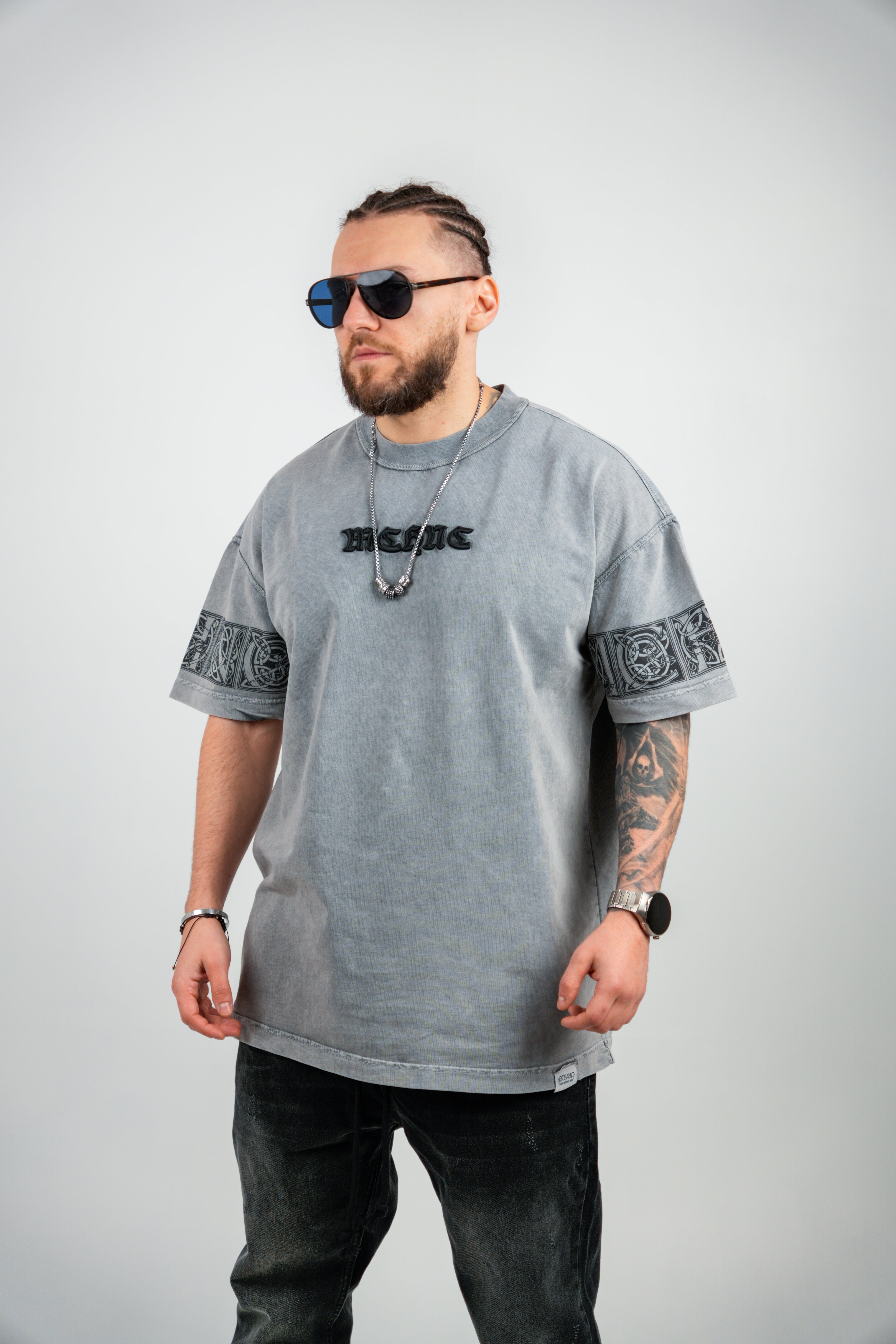 Tricou oversize imprimat, din bumbac organic cu decolteu rotund, umeri cazuti si baza dreapta cu tăietură laterală pe tiv, jos