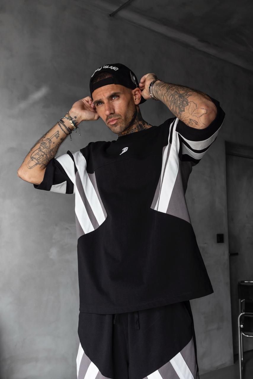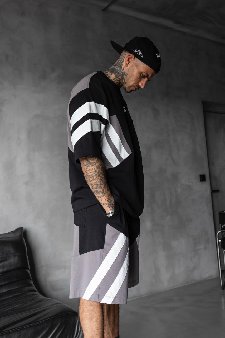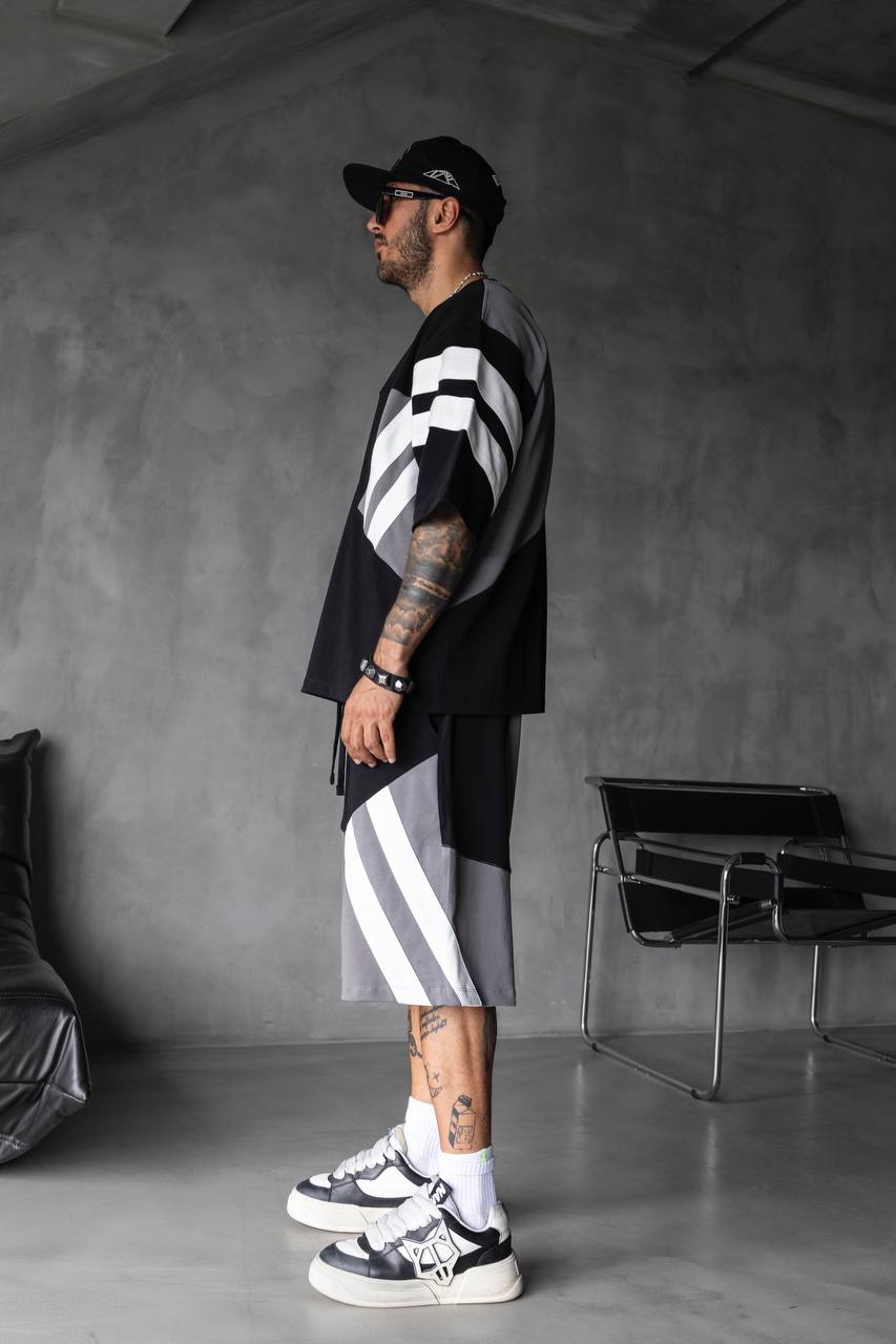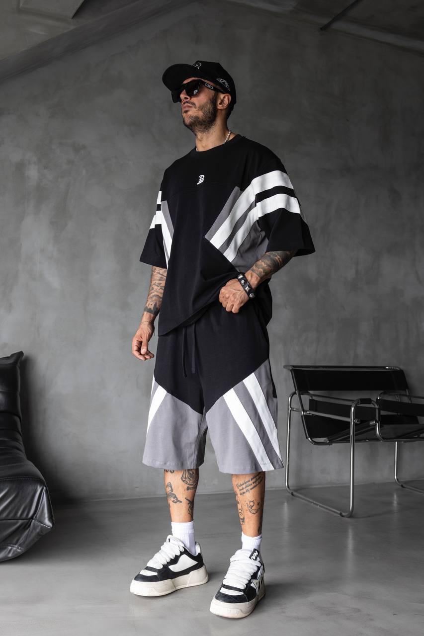 Compleu premium unisex din 100% bumbac – format din tricou oversized și pantaloni scurți, cu design geometric inspirat de mișcare, contrast și stradă.